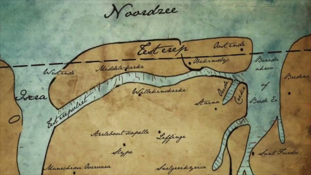 Notons, pour la petite histoire, qu’Ostende (Oostende) formait l’extrémité orientale d’une île (vaste banc de sable) située devant le port de Bruges et que l’extrémité occidentale avait comme village… Westende. Il semblerait cependant que cette « île » n’était véritablement séparée du continent que lorsque la marée était haute. La carte ci-dessous permet de se faire une bonne image de la configuration de notre région côtière à l’époque.