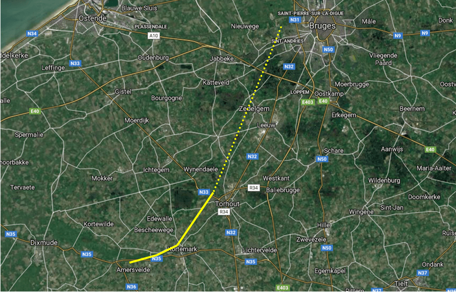 Probable trajectoire suivie par la tornade de Kortemark du 2 septembre 1902. Source : Google MapsProbable trajectoire suivie par la tornade de Kortemark du 2 septembre 1902. Source : Google Maps