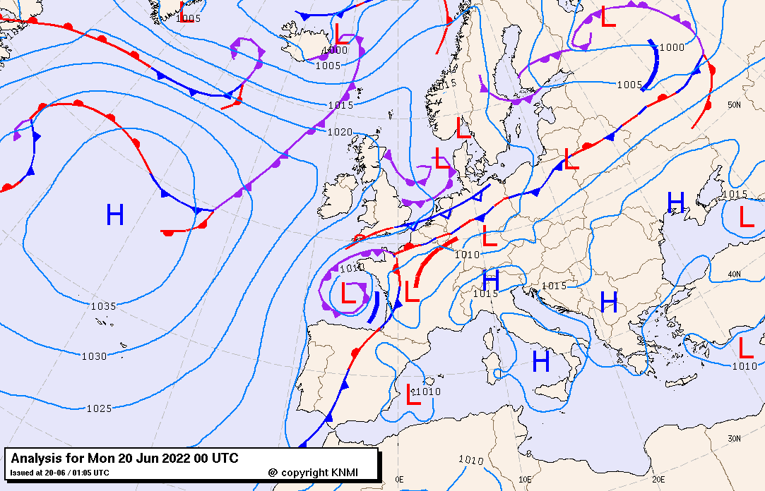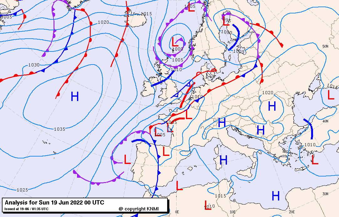 Situation synoptique du 19 juin 2022 à 2h00. Source : KNMISituation synoptique du 19 juin 2022 à 2h00. Source : KNMI