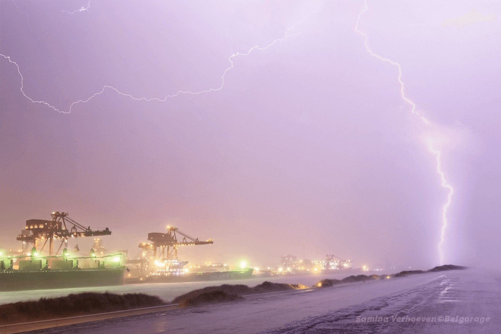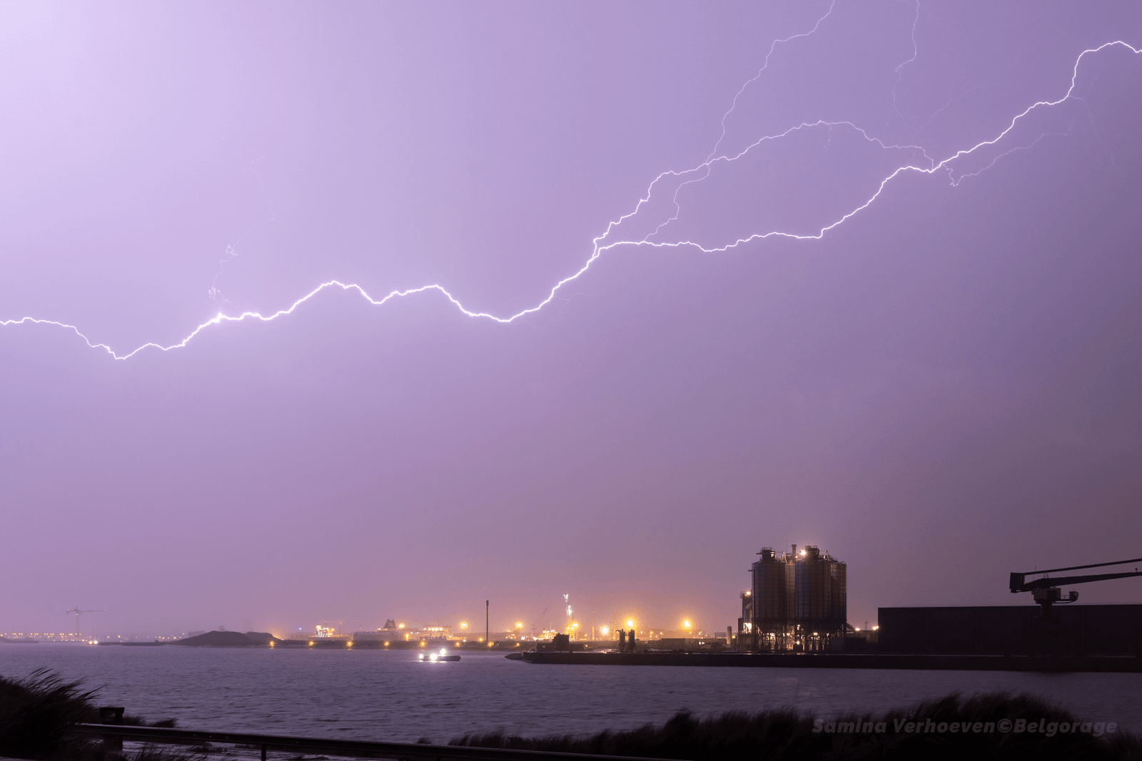 Coup de foudre descendant négatif près du port de Dunkerque dans le département du Nord en France, le 19 juin 2022 vers 3h15 du matin. Crédit photo : Samina VerhoevenCoup de foudre descendant négatif près du port de Dunkerque dans le département du Nord en France,