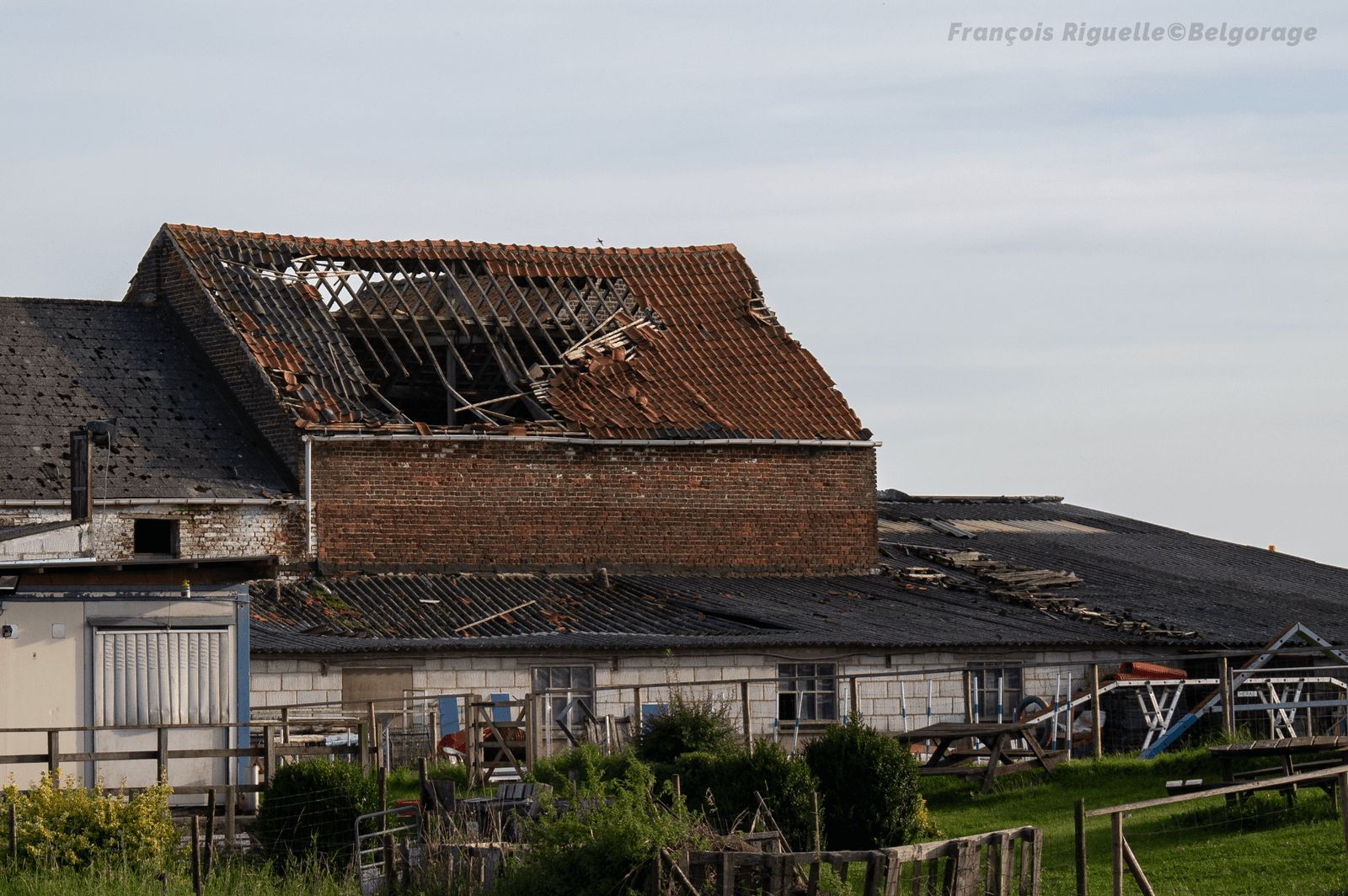 Dès lors, au vu des dommages constatés sur les habitations, l’intensité maximale du phénomène est estimée au niveau T3 (rafales de vent de 149 à 183 km/h). Toutefois, le niveau T4 semble avoir été approché sur base des dommages engendrés sur certains arbres.
