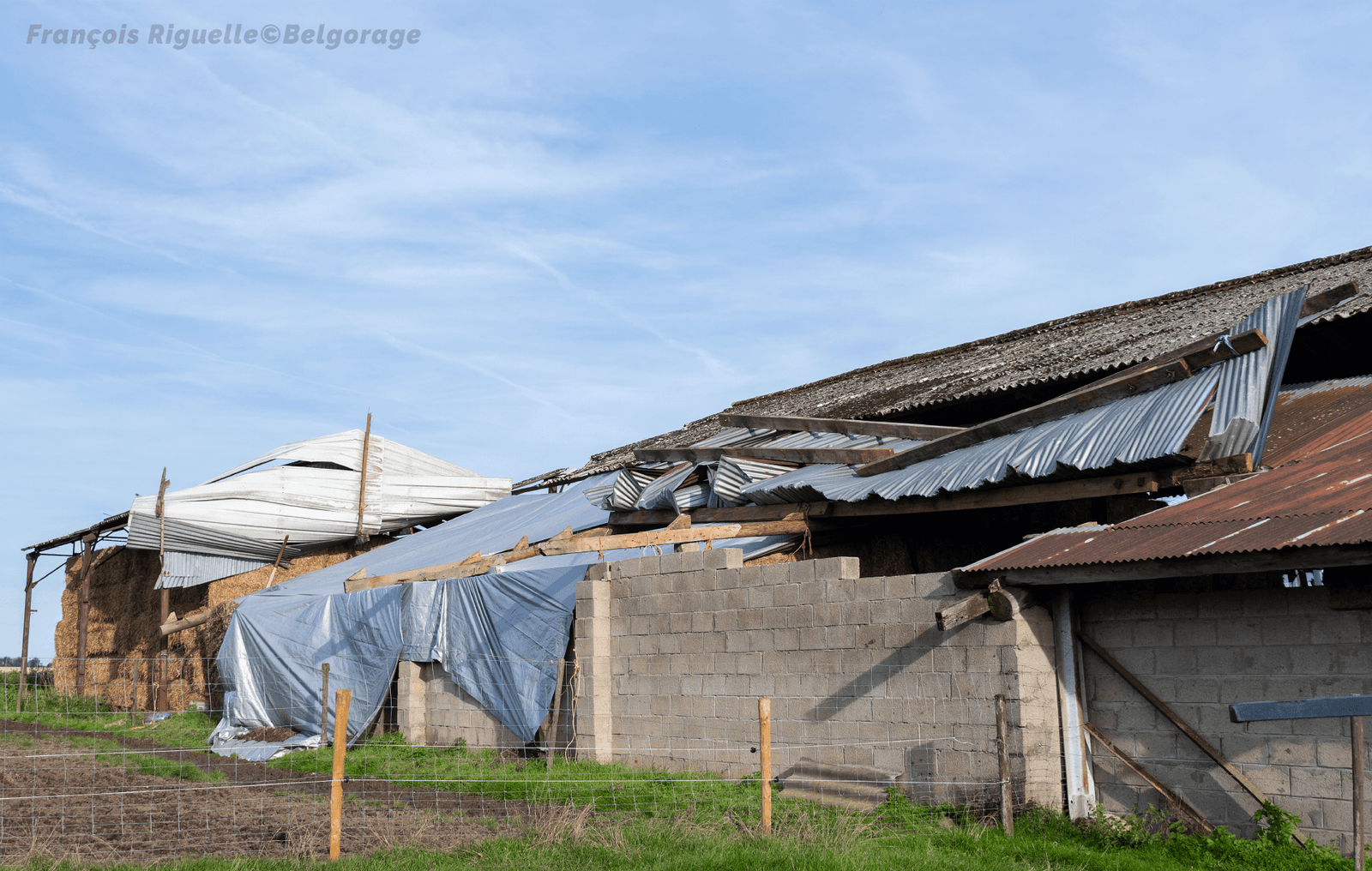 Toitures envolées sur des bâtiments agricoles à Bomal, le 25 août 2023.