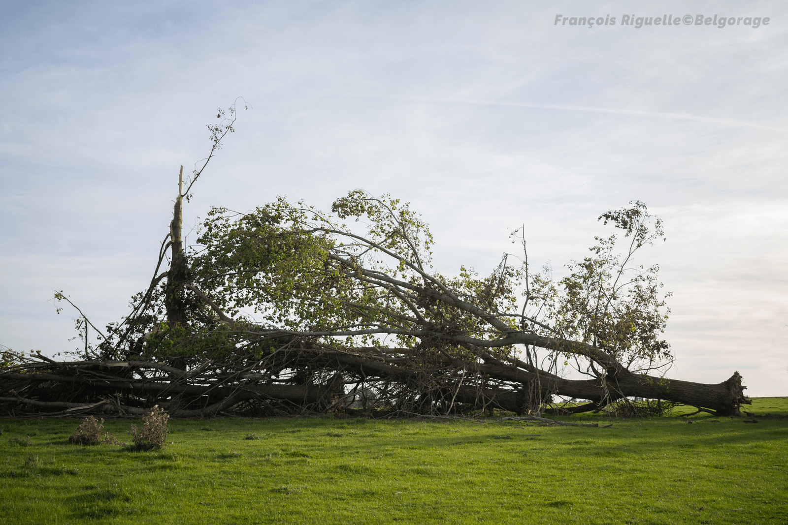 Enfin, il faut également préciser que les dommages sont bien divergents, surtout lorsque l’on compare les deux extrémités du couloir. En effet, sur la bordure nord, les dégâts sont orientés nord-nord-est (même nord-nord-ouest pour certains), tandis que sur la bordure sud, ils sont plutôt orientés est-sud-est. Le même constat est réalisé dans les couloirs secondaires causés par les burst swaths, avec, là aussi, des dégâts divergents visibles dans les casses d’arbres et la végétation herbacée. En outre, pour donner un exemple du caractère localisé des plus fortes rafales, nous avons une ligne de vieux peupliers située entre Bomal et Mont-Saint-André. La moitié de cette ligne est abattue, tandis que l’autre moitié est presque intacte.