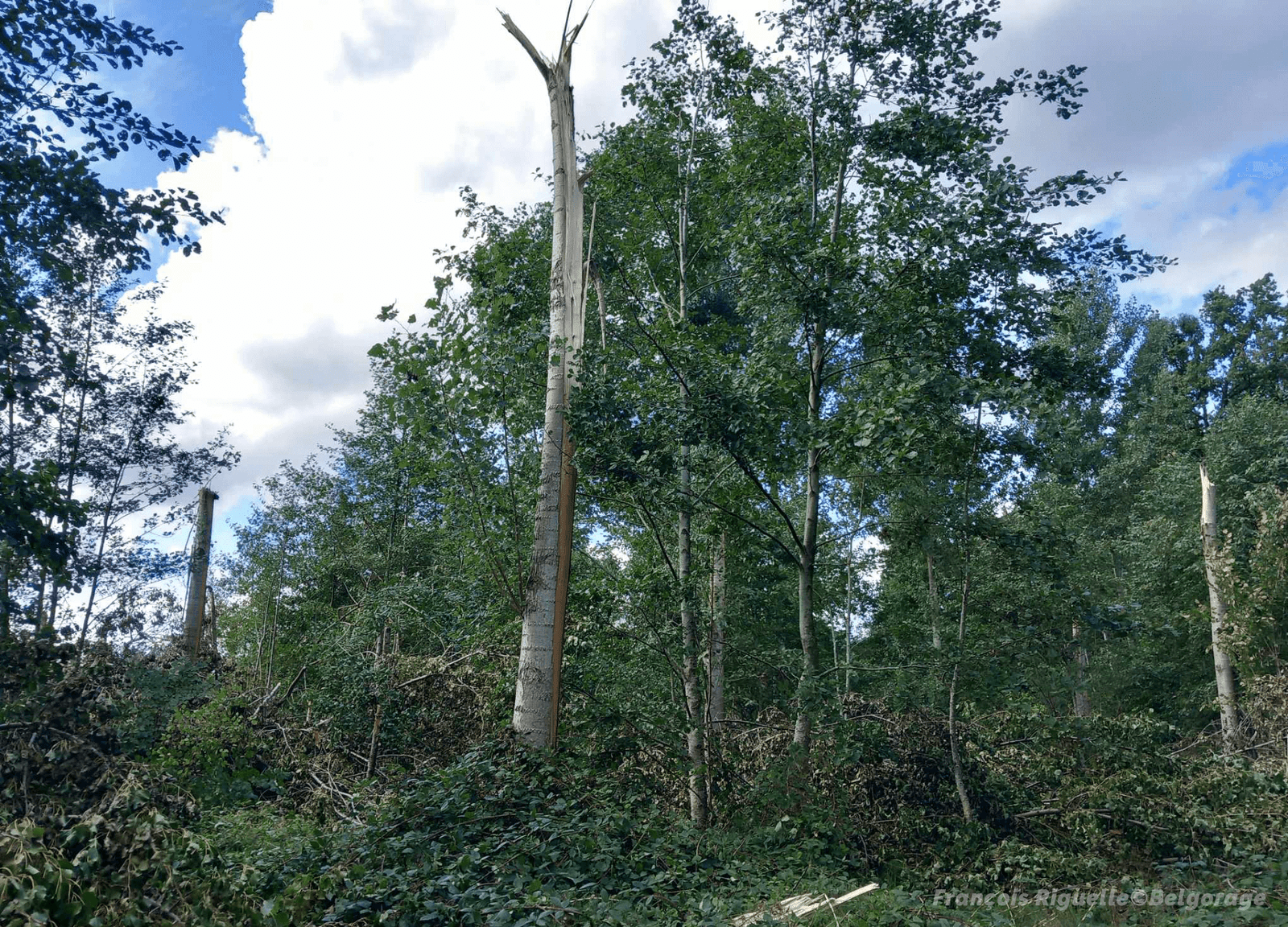 Arbres brisés à la suite de rafales descendantes à Ottignies, en province du Brabant Wallon, le 25 août 2023. Crédit : François Riguelle.