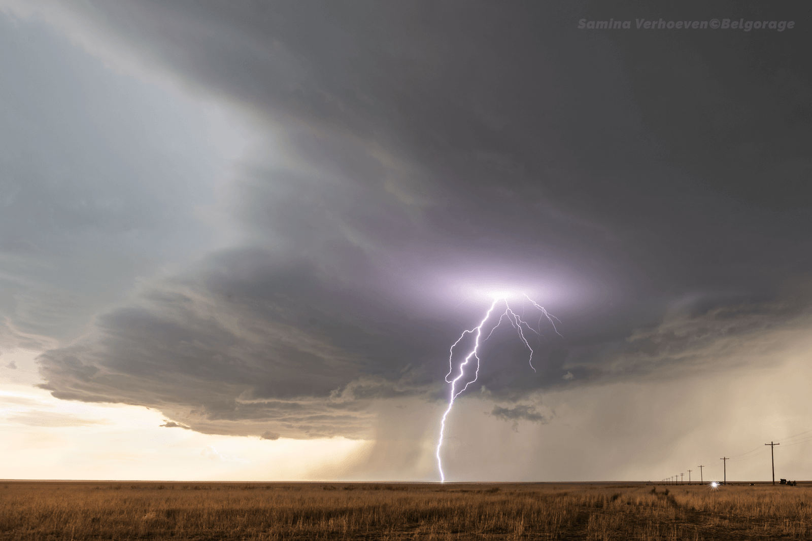 Orage isolé produisant une activité électrique modérée non loin de la région de Fort Stockton au Texas, le 31 mai 2019 à 21h45. Celui-ci génère quelques coups de foudre dont un extranuageux comme illustré ici. Crédit photo : Samina Verhoeven