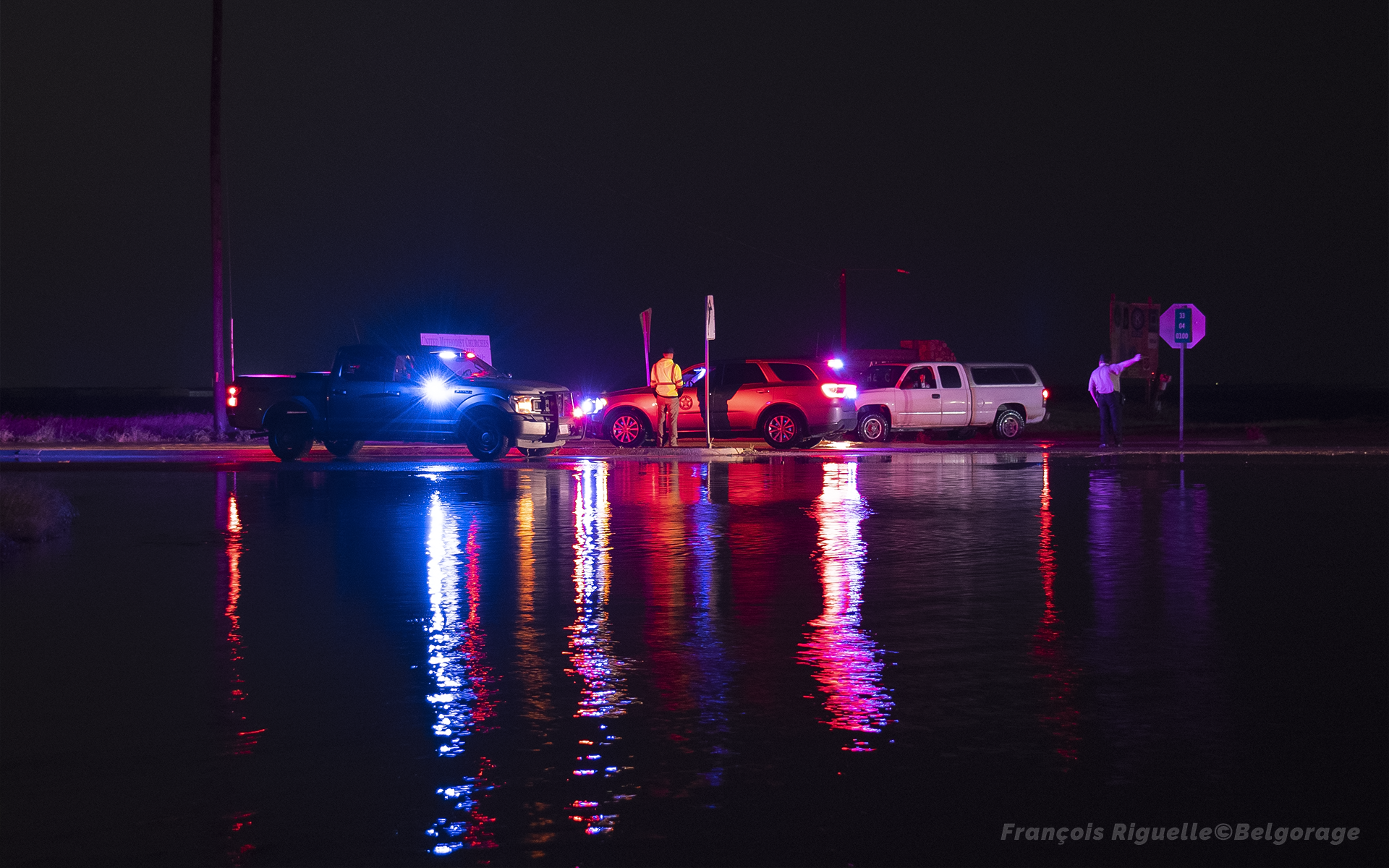 Ensuite, on essaye de suivre l’orage au déclin du jour mais on se retrouve bloqué par les dégâts de la précédente tornade, tandis que les routes secondaires en terre ou en gravier sont impraticables à cause des précipitations. D’ailleurs, de nombreux traqueurs sont embourbés. Ainsi, pas d’autre choix que d’attendre l’ouverture de la chaussée, à défaut de devoir faire un énorme détour. Cependant, après le passage libéré à la nuit tombée, nous nous retrouvons à nouveau rapidement coincés par d’importantes inondations à l’entrée de la ville d’Altus, mettant un terme à tout espoir de rattraper l’orage.