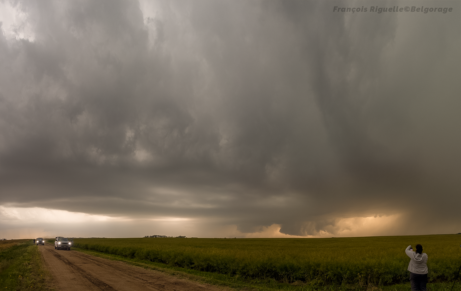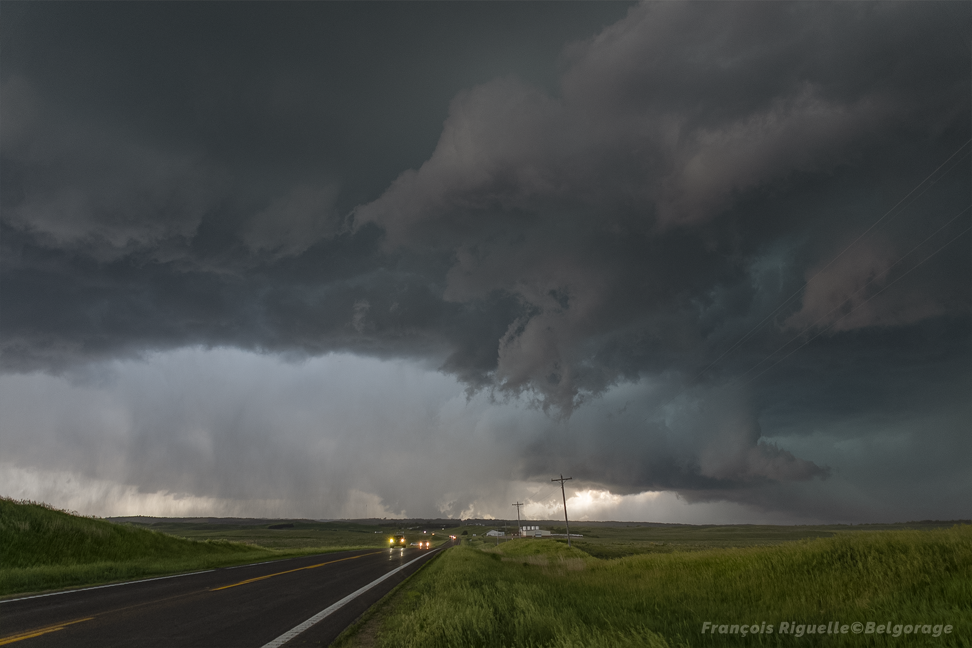 Néanmoins, son développement est explosif, à un tel point que nous ne l’avions encore jamais expérimenté. Toujours sans connexion internet, nous essayons une interception à vue. Cependant, alors que nous pensons réussir à devancer la cellule, le mésocyclone traverse la route quelques kilomètres à peine devant nous, rasant littéralement le sol. Par sécurité, sous un inflow très impressionnant, on se gare et nous décidons de capturer les éléments qui s’offriront à nous. Et nous n’avons pas été déçus.