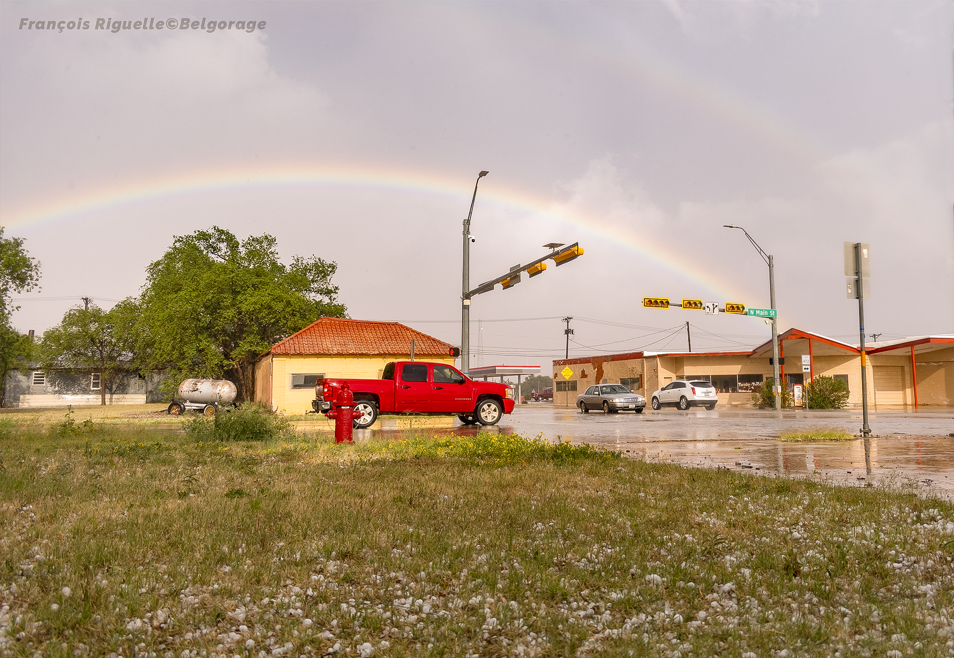 Enfin, nous décidons de nous laisser submerger par l’orage dans cette même ville de Tahoka, pour capturer des images des chutes de grêle. Et c’est une grande réussite, car le lent déplacement de l’orage nous permet de trouver un abri et de nous préparer à immortaliser le phénomène du début à la fin, le tout dans l’ambiance urbaine.