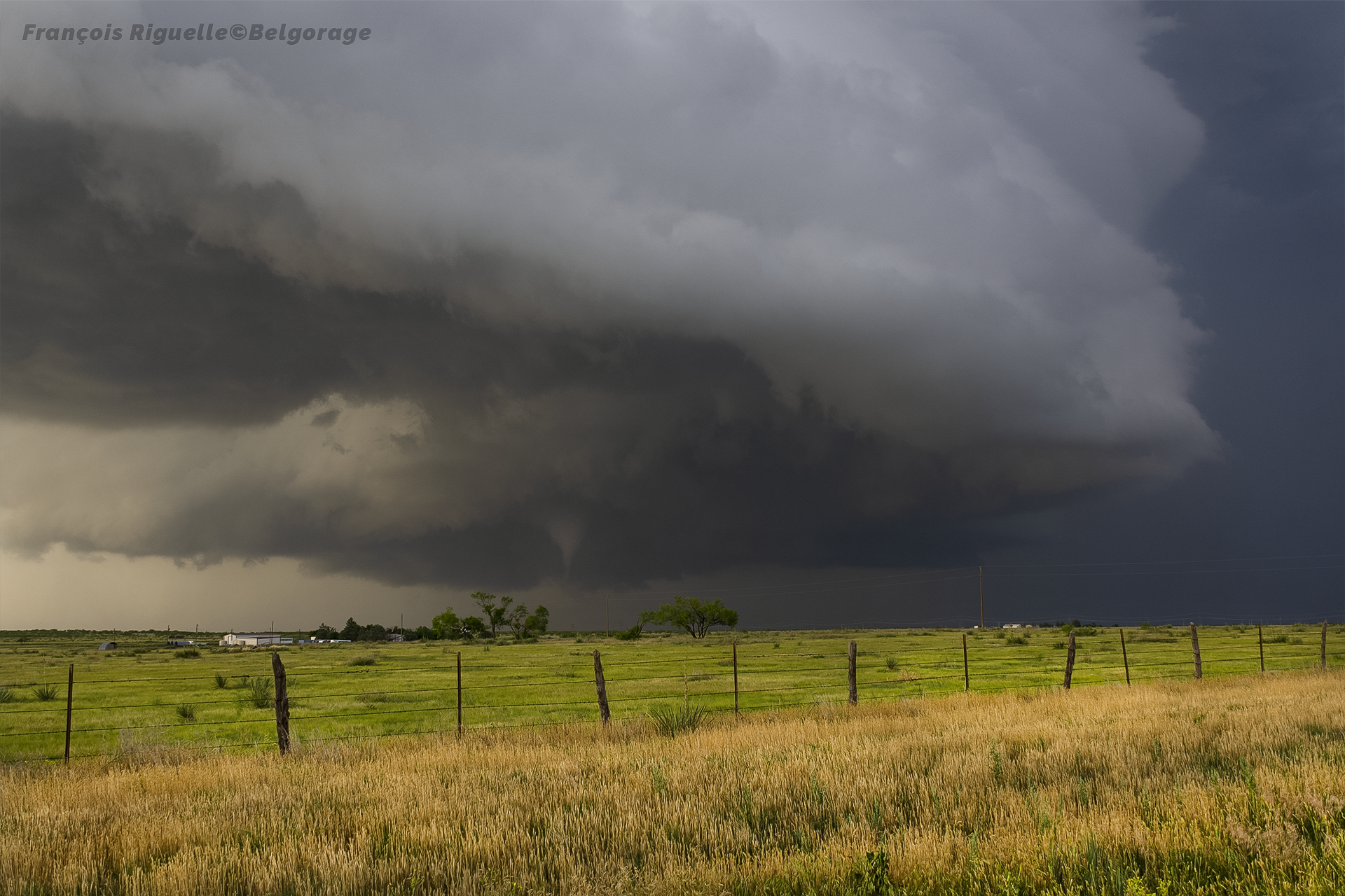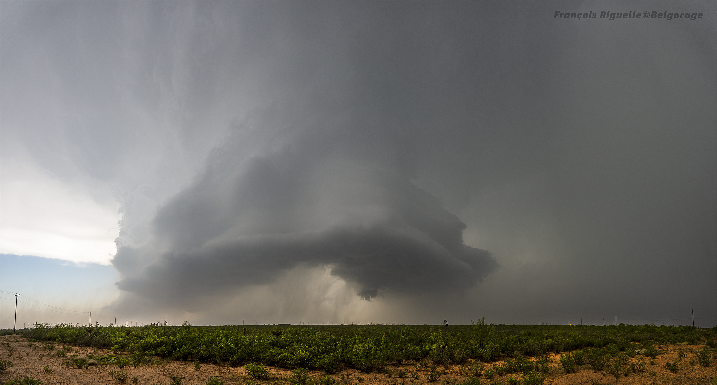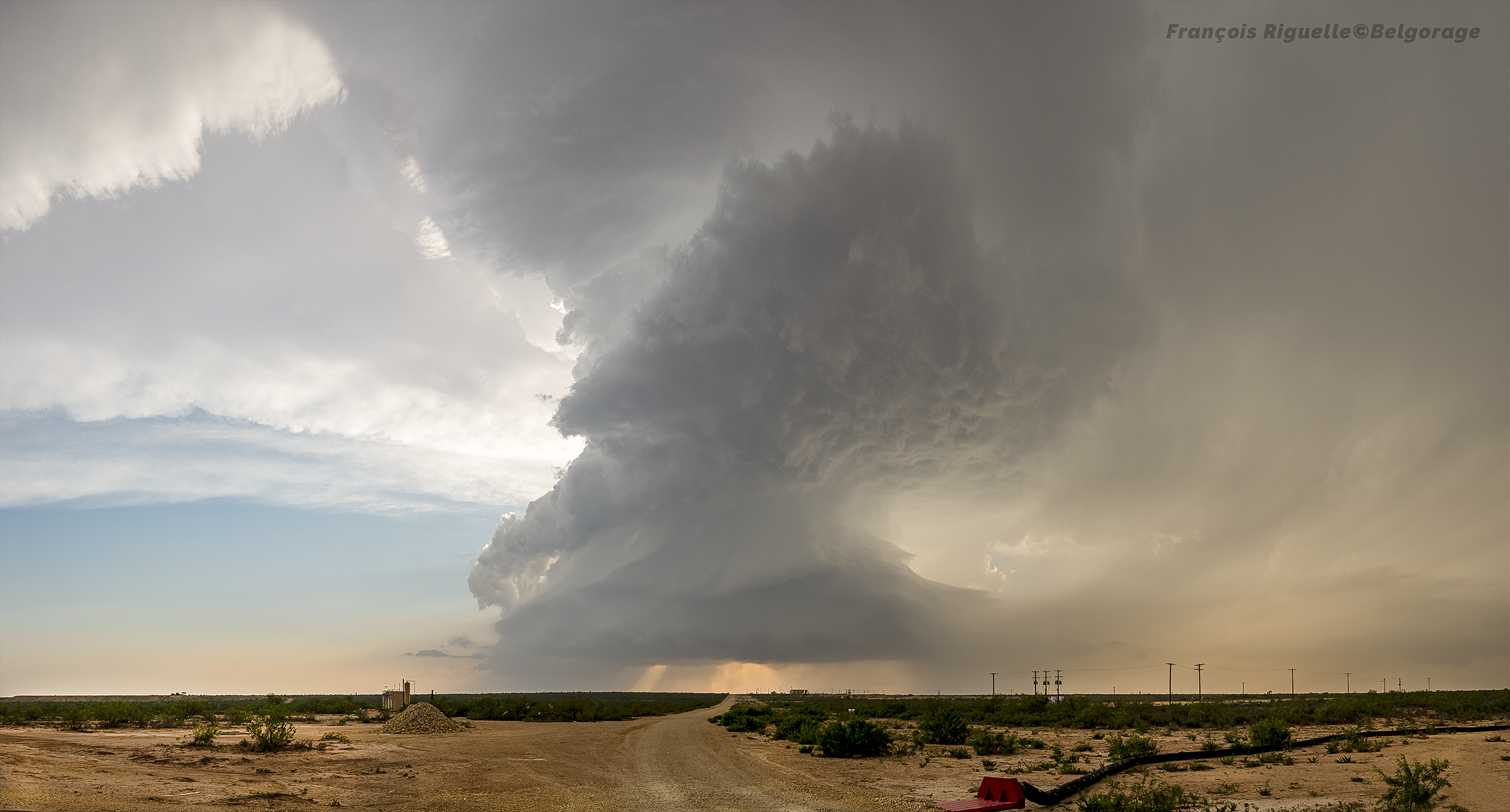 Le 1er juin, la fatigue s’accumule. Pourtant, pas le temps de se reposer, car la journée est une nouvelle fois prometteuse. De plus, la chaleur est accablante dans la région désertique du sud-ouest du Texas où nous nous rendons. Après un arrêt pour manger notre repas de midi à Alpine, les premiers orages se déclenchent dans les montagnes. Mais, comme le réseau routier est très pauvre, il n’est pas possible de directement aller à leur rencontre. Ainsi, on attend que la cellule la plus active nous atteigne. Après cette attente obligée et oppressante, l’orage se présente enfin devant nous, très massif, avec son nuage-mur typique des supercellules classiques. Depuis notre point de vue, nous restons au sec suffisamment longtemps pour observer l’abaissement nuageux translater proche devant nous, alors que les précipitations tombent dans notre dos. À ce moment, une tornade touche le sol devant nos yeux à peu de distance, mais, encore une fois, non condensée et assez brève.