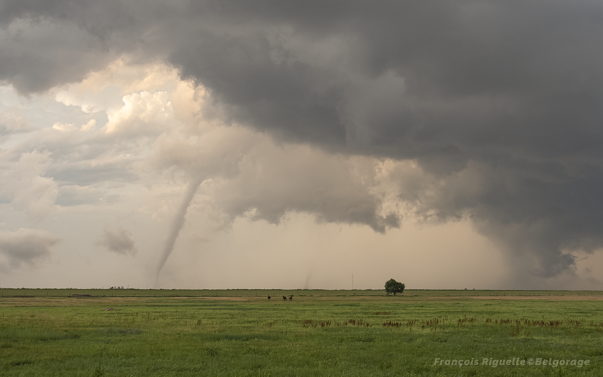 À ce moment, alors qu’un tuba se forme devant notre position, un train passe à vitesse réduite, masquant totalement notre point de vue, le seul à proximité. Après une attente interminable, le dernier wagon passe au moment où un contact avec le sol est visible. Une tornade sévit alors à quelques centaines de mètres seulement de notre position, mais elle n’est malheureusement pas condensée et ne dure guère plus de 2 à 3 minutes.